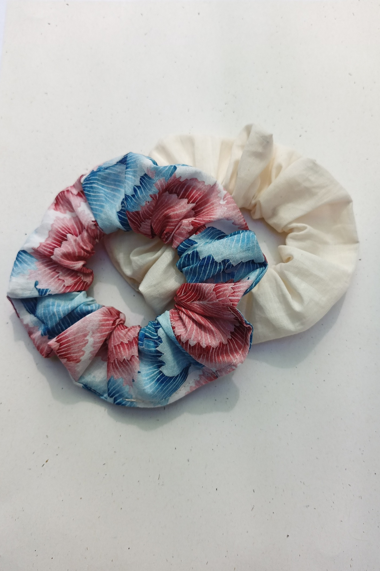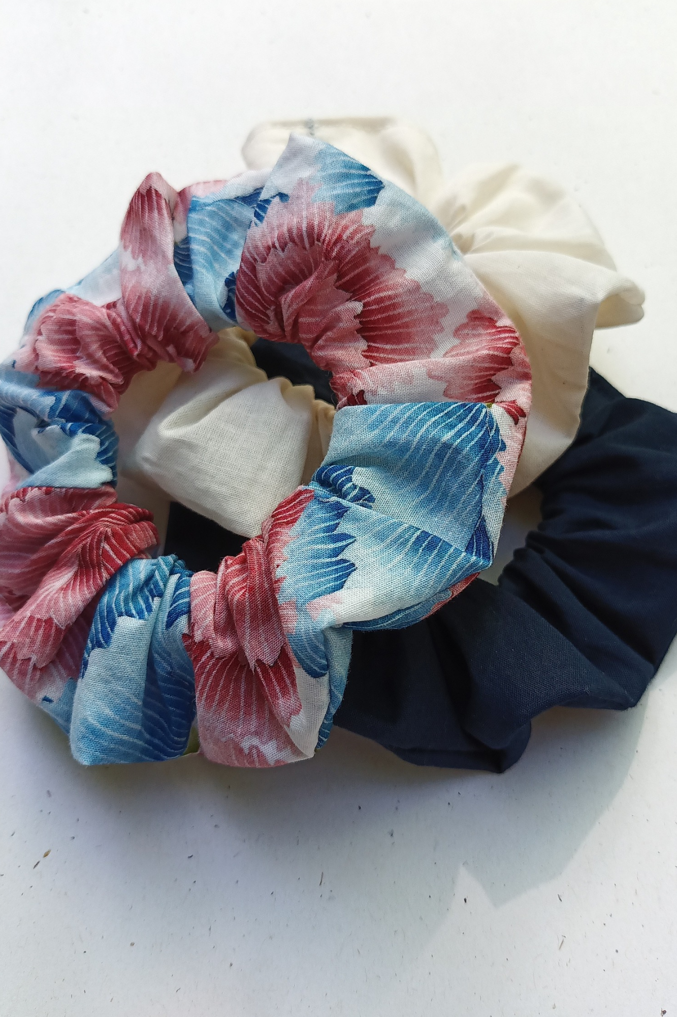 Chouchou en voile de coton biologique fabriqué en France. Imprimé floral bleu, blanc et rose.