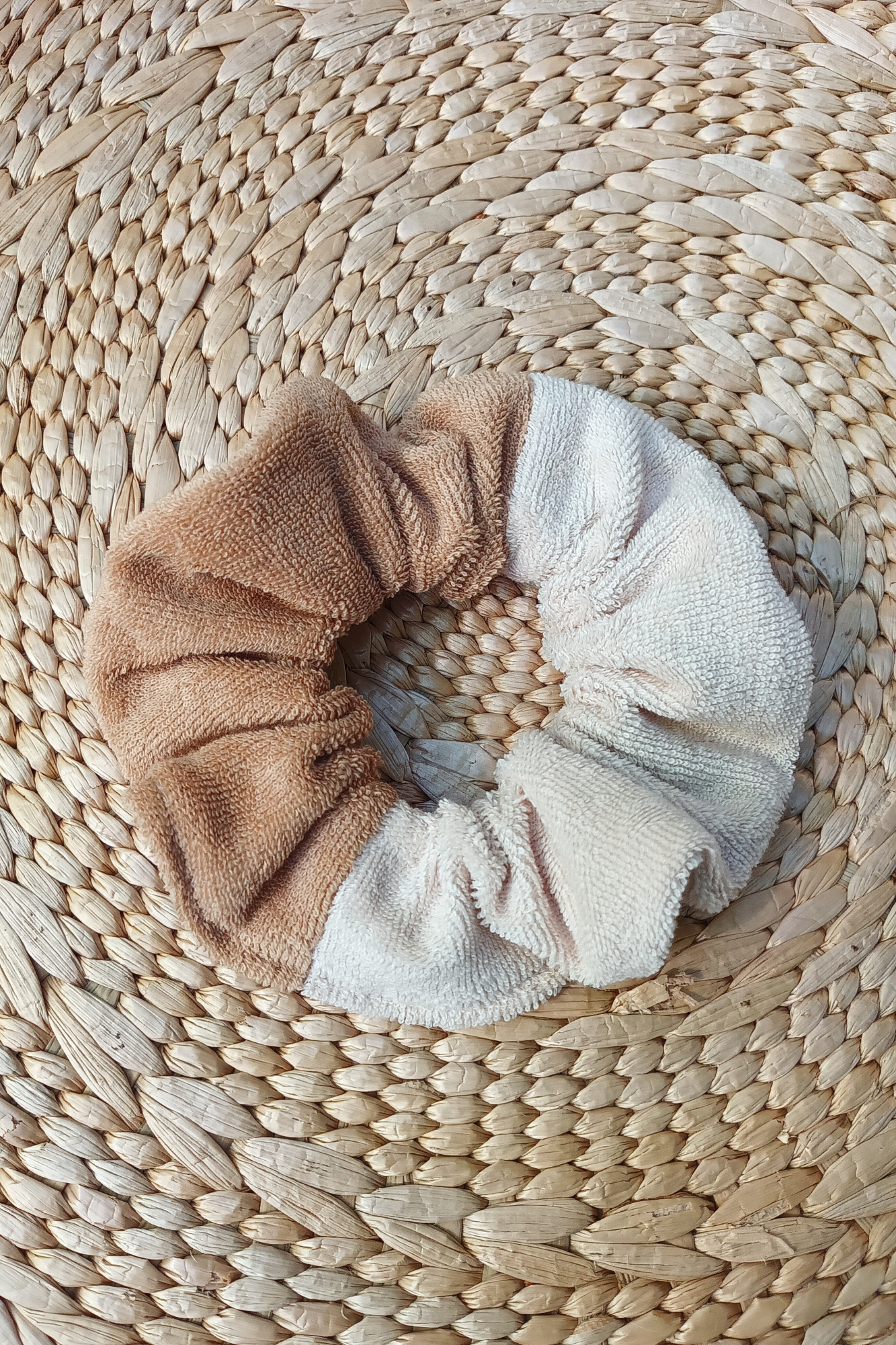 Chouchou en éponge de coton biologique fabriqué en France. Bicolore ; écru/tan et écru/bleu roi.