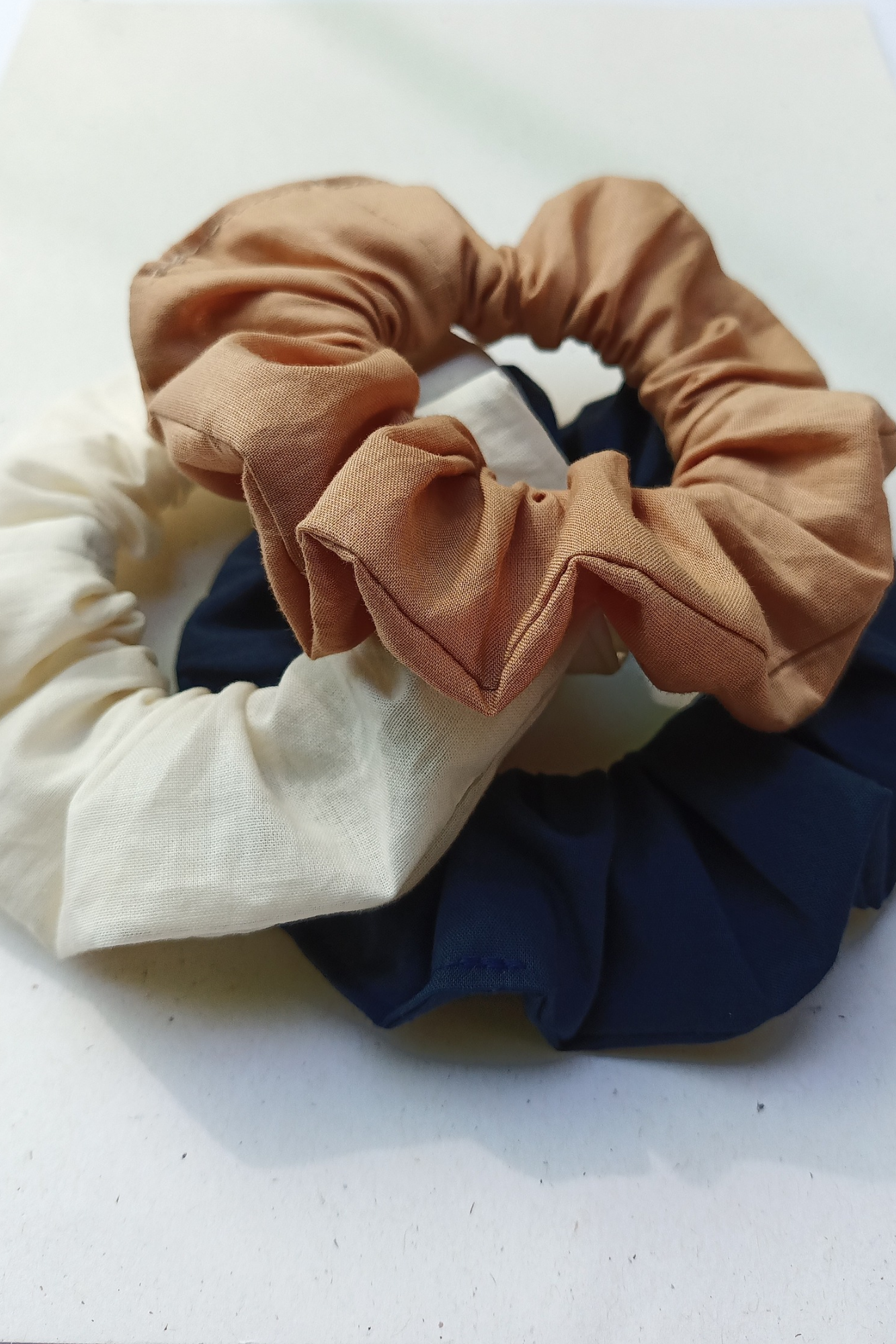 Chouchou en voile de coton biologique fabriqué en France. 3 coloris disponibles ; bleu marine, écru et tan.