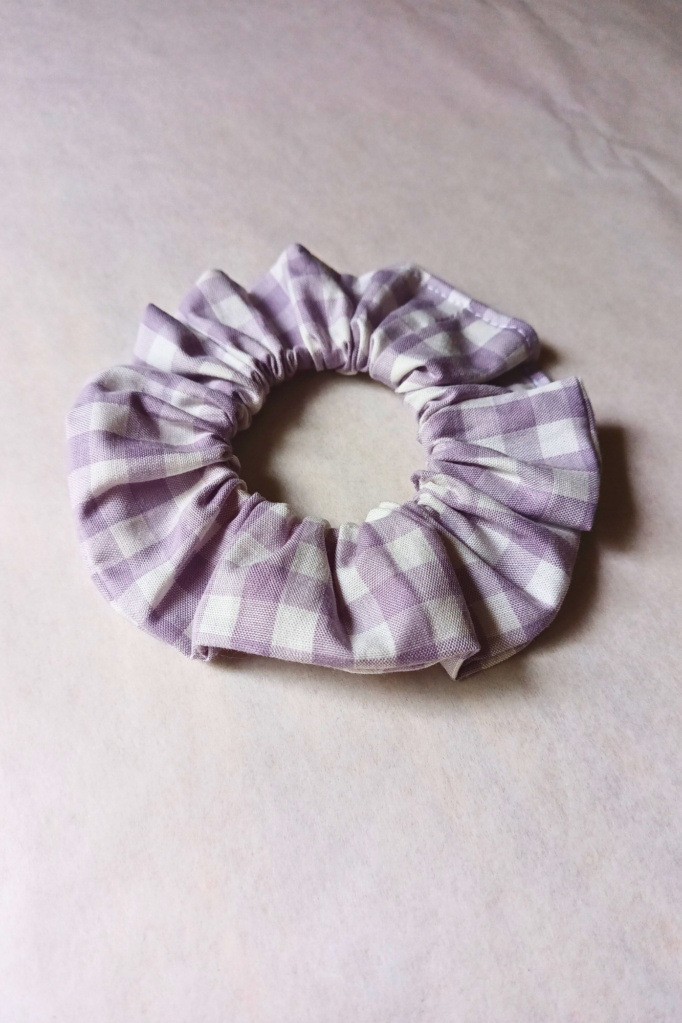 Chouchou en popeline de coton biologique fabriqué en France. Vichy lavande et blanc.