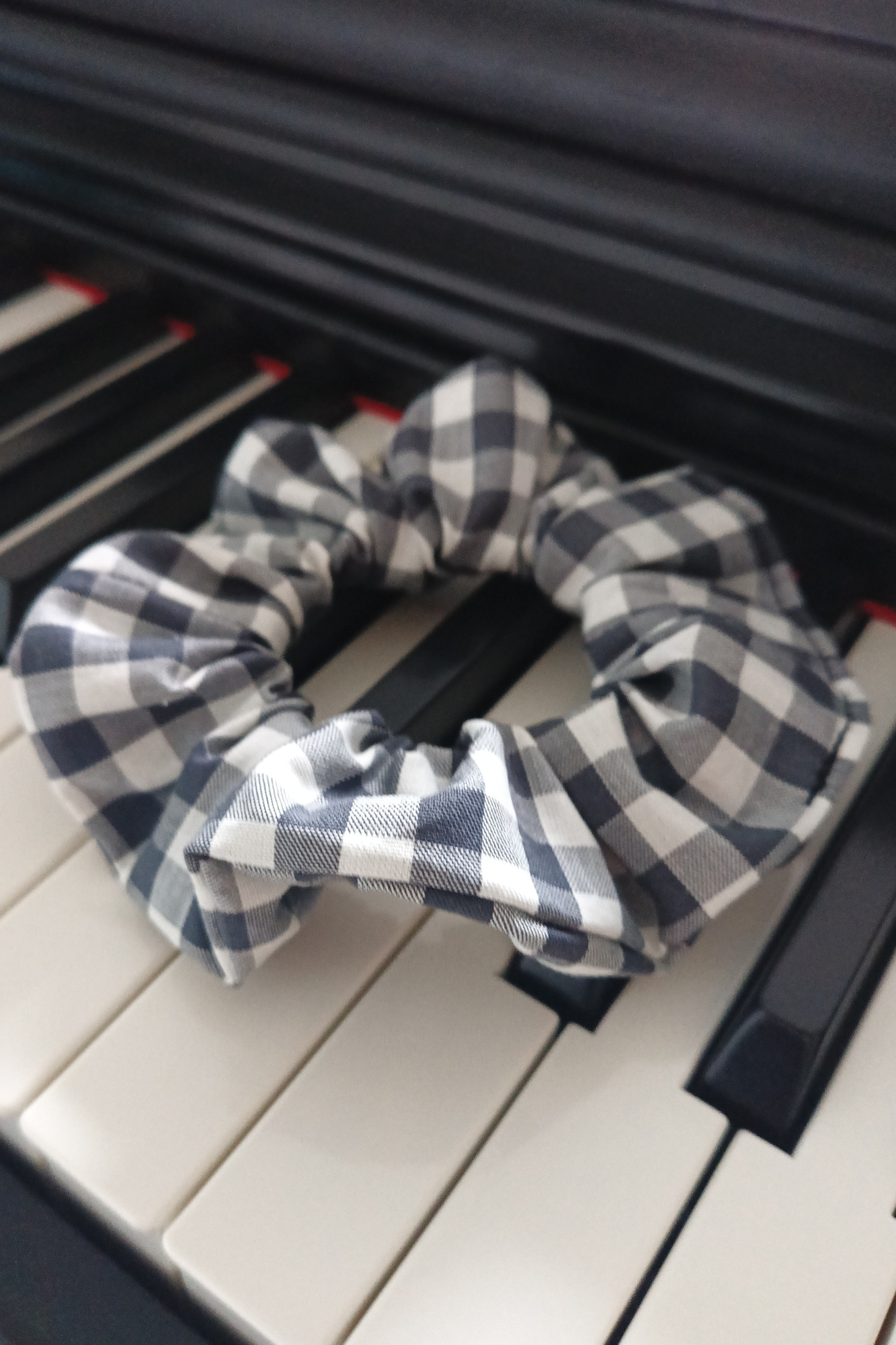 Chouchou en popeline de coton biologique fabriqué en France. Vichy anthracite et blanc.