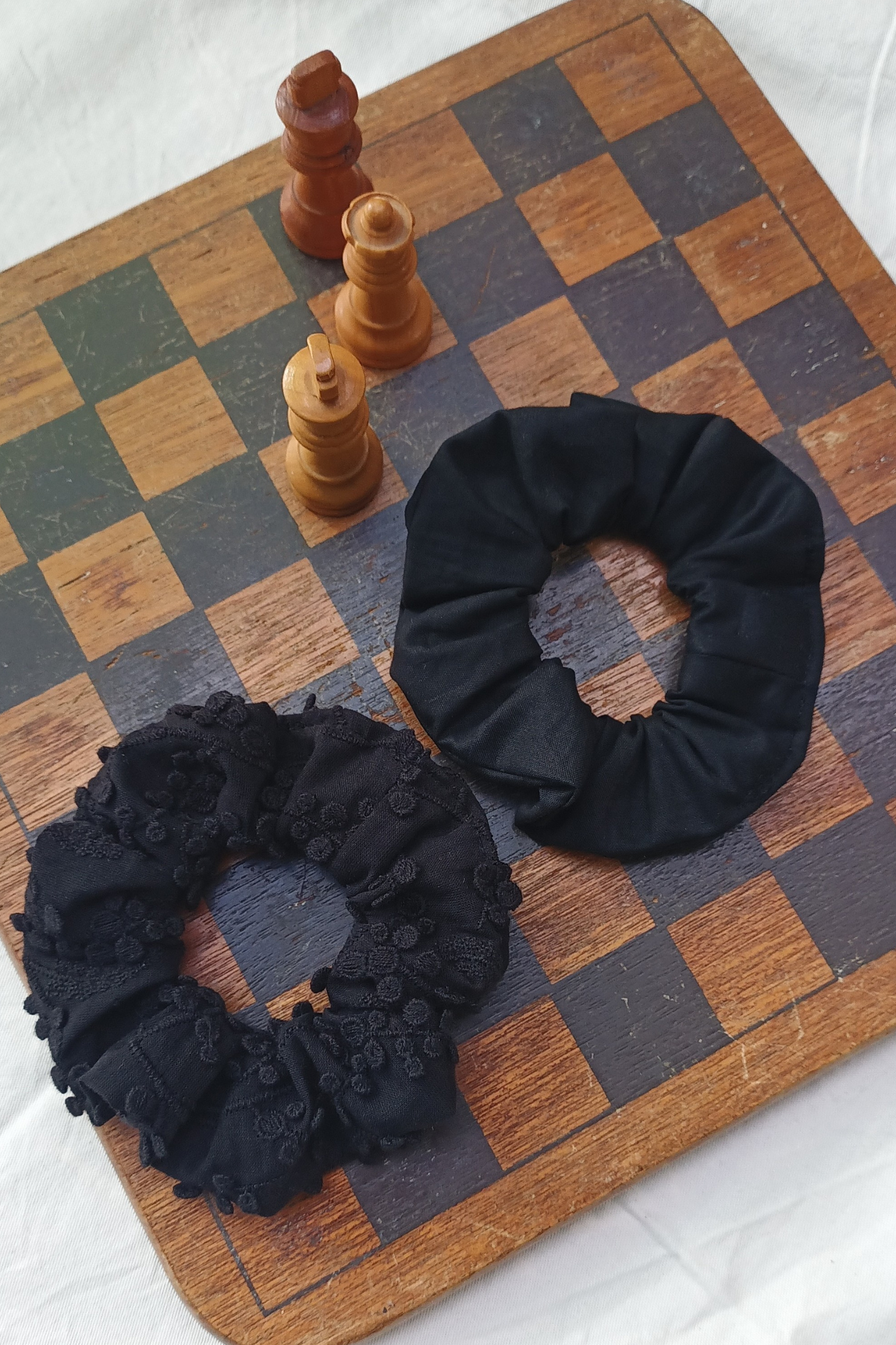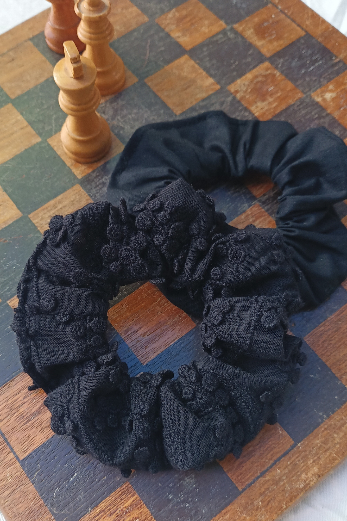 Lot de 2 chouchous fabriqués en France. Un modèle en voile de coton biologique brodé et un modèle en popeline de coton biologique.