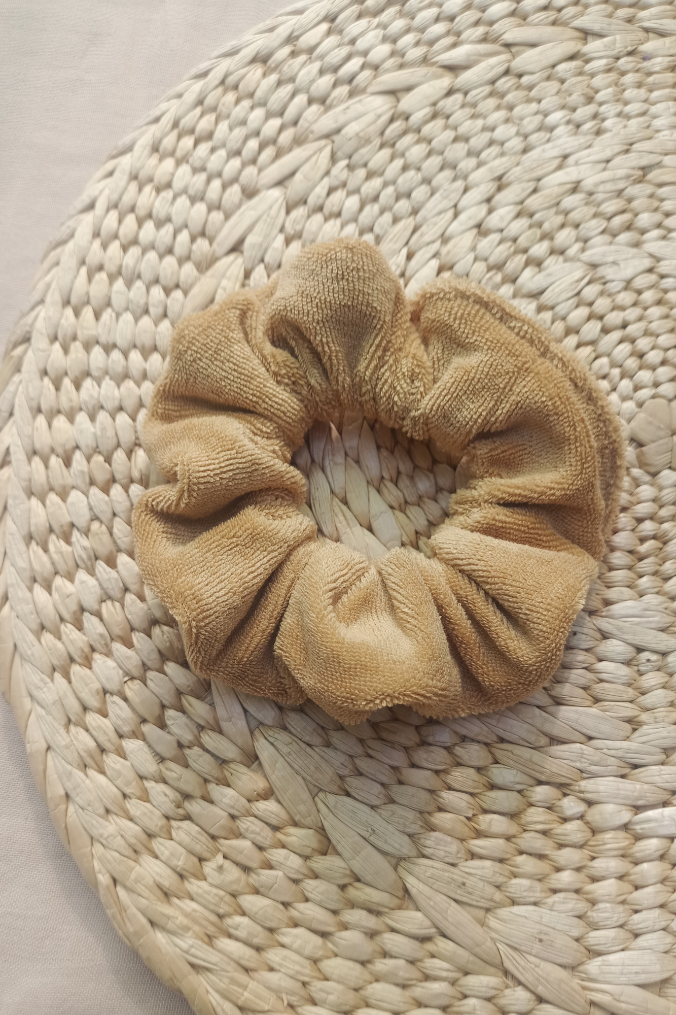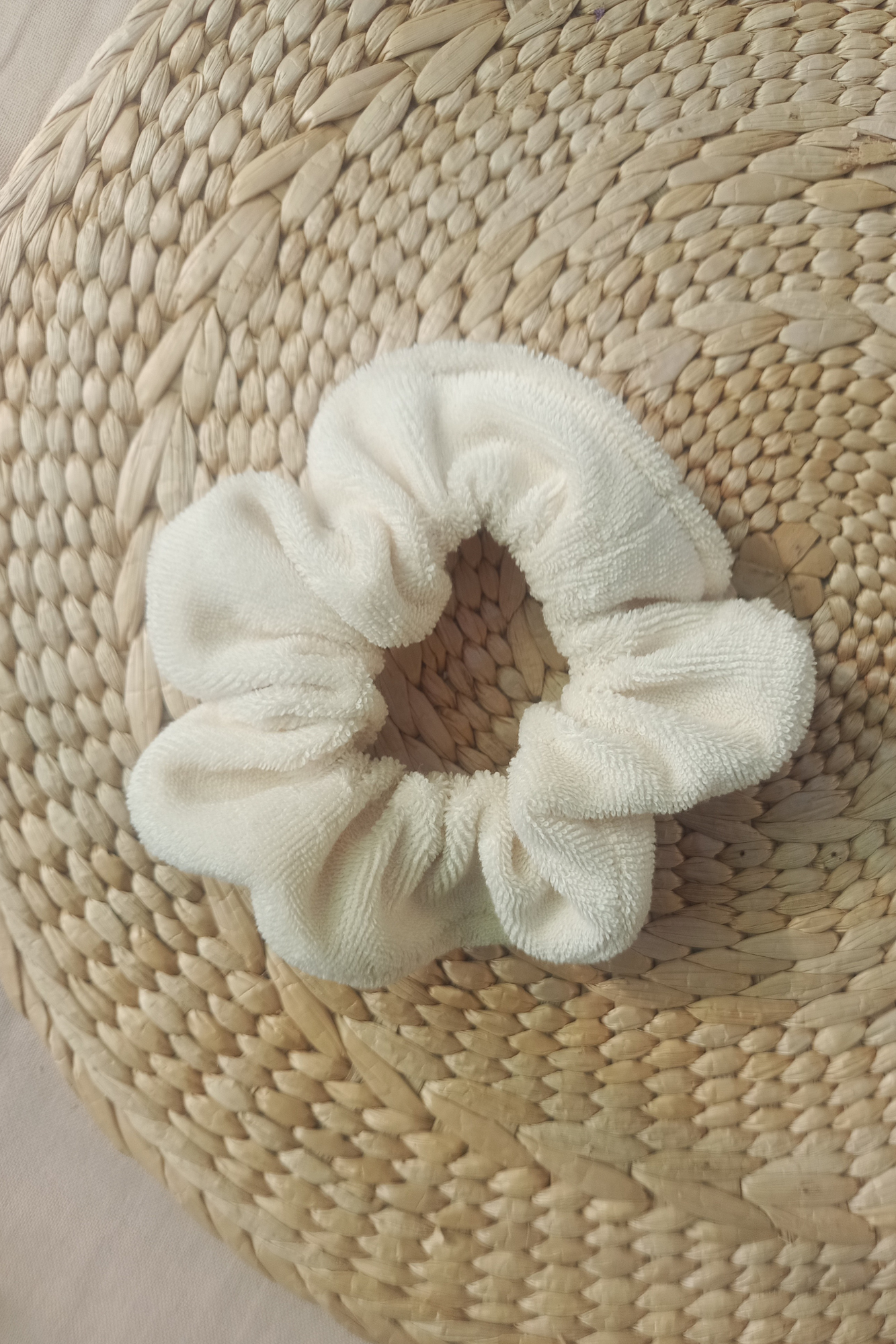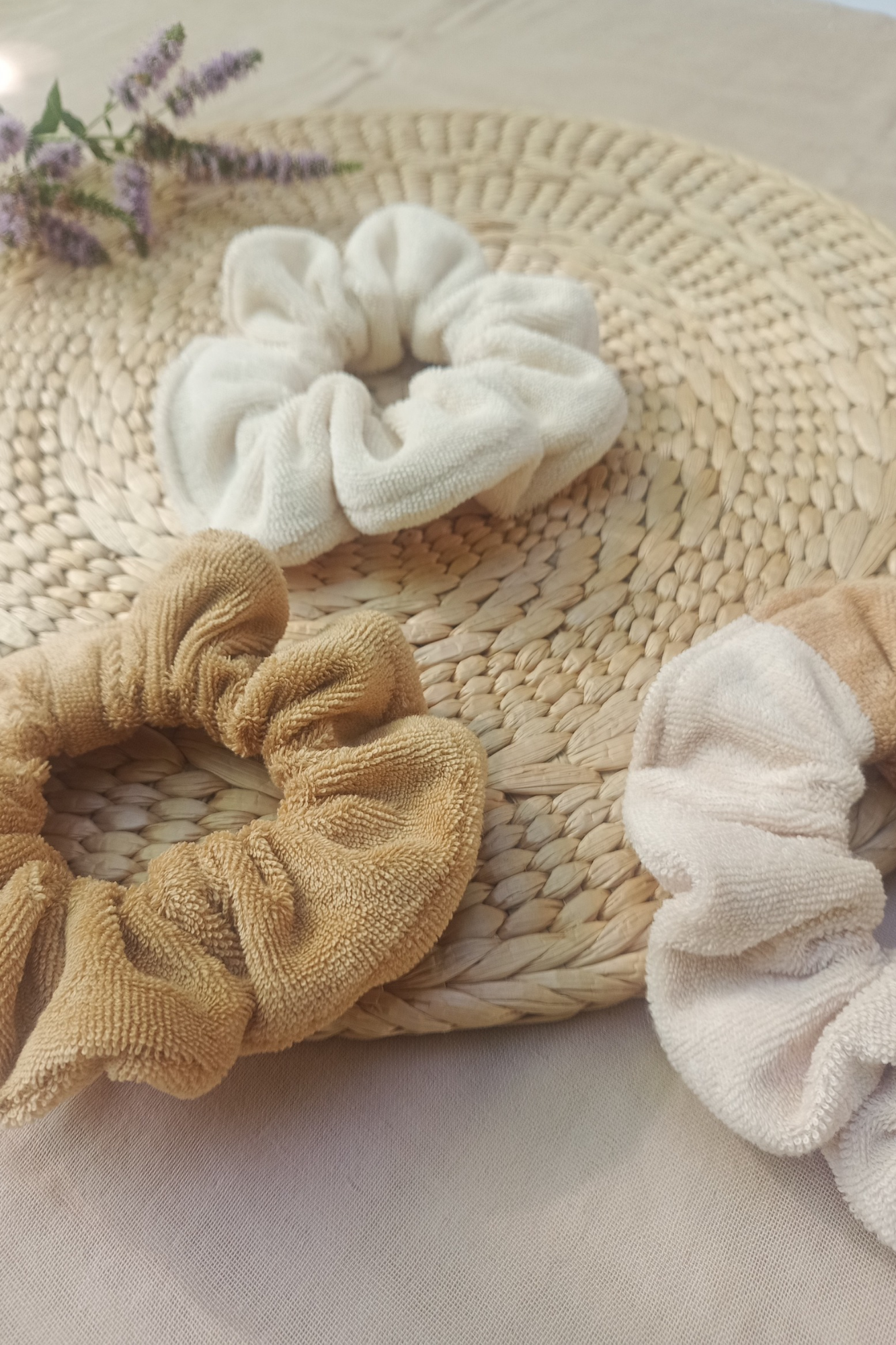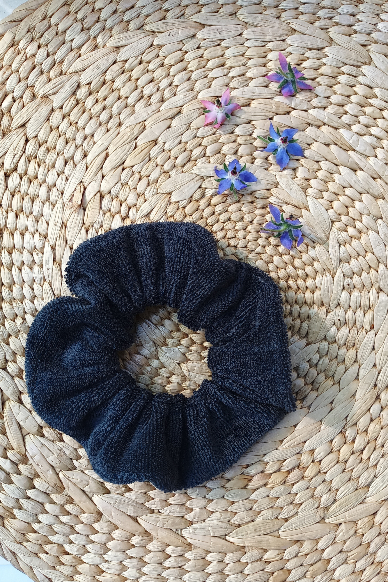 Chouchou en éponge de coton biologique fabriqué en France. 4 coloris disponibles ; bleu roi, gris anthracite, écru et tan.