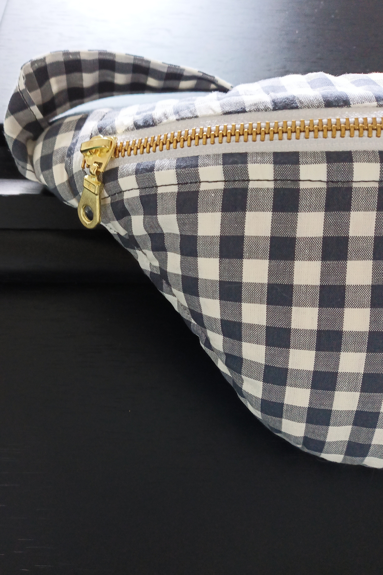 Réalisé dans une popeline vichy anthracite et blanche. Pochette intérieure zippée, intérieur matelassé, sangle réglable.
